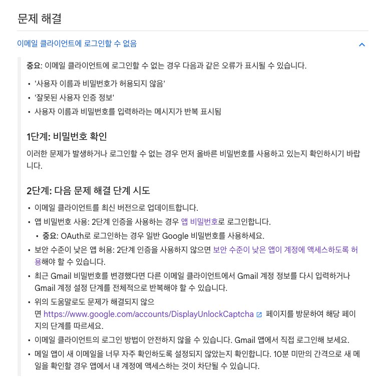1) 에러: org.springframework.mail.MailAuthenticationException: Authentication failed; nested exception is javax.mail.AuthenticationFailedException: 535-5.7.8 Username and Password not accepted. Learn more at