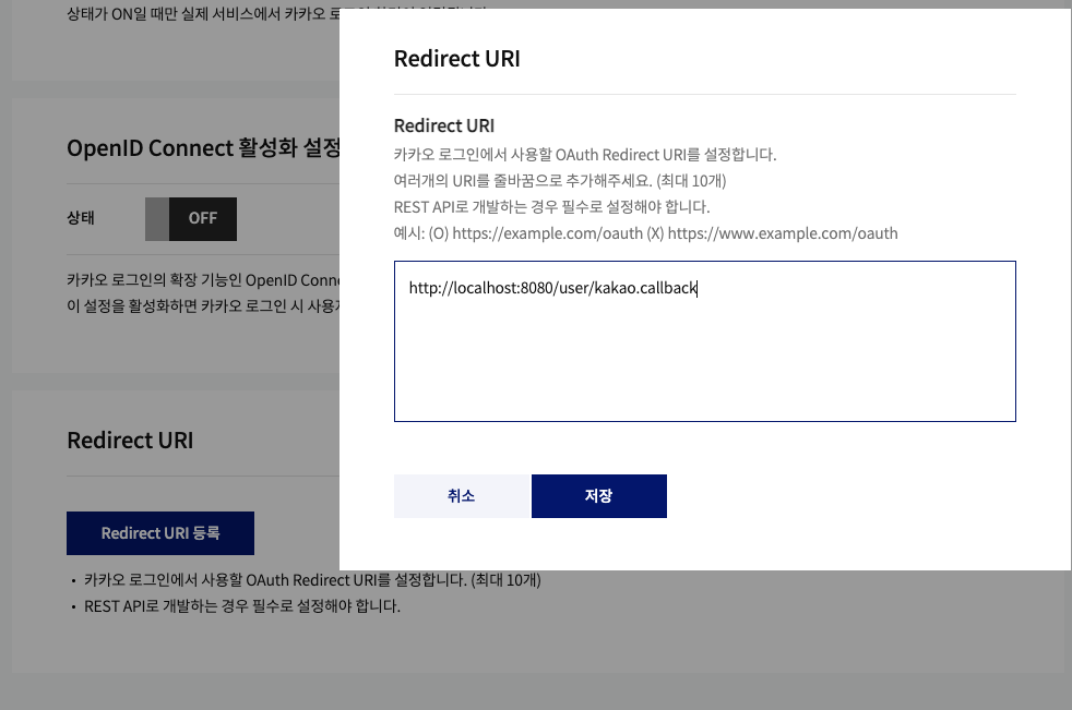 7) 카카오로 로그인 했을 때 인가토큰을 받게 될 Redirect URI (callback) 설정