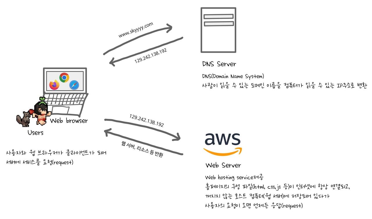 브라우저에 주소를 입력하면 DNS Server로 전달 되고, DNS서버에서는 해당 도메인 주소의 IP를 보내준다. IP를 웹서버로 보내면 해당 요청에 맞게 응답한다.