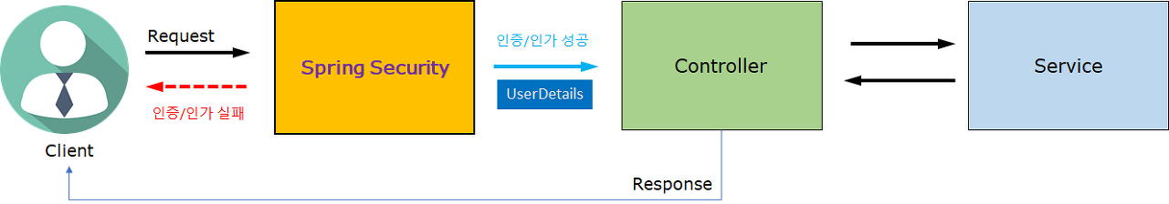 - 인증과 인가 실패 시: Controller 로 Client 요청 전달되지 않음 Client 에게 Error Response 보냄