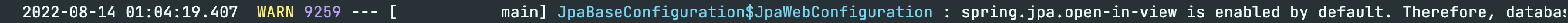 원인: Spring Boot에서는 spring.jpa.open-in-view를 true로 설정하고 있는데 *OSIV측면에서 성능이나 확장성을 위해false로 해야 하는데 true로 하고 있어 warning 경고 사인 발생