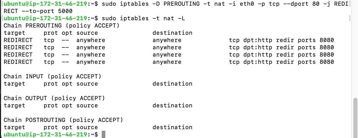 sudo iptables -D PREROUTING -t nat -i eth0 -p tcp --dport 80 -j REDIRECT --to-port 5000