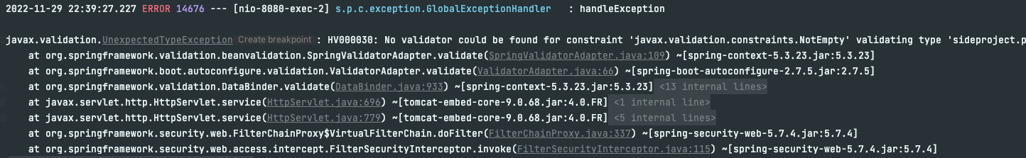 javax.validation.UnexpectedTypeException: HV000030: No validator could be found for constraint 'javax.validation.constraints.NotEmpty' validating type 'sideproject.petmeeting.post.domain.Category'. Check configuration for 'category'