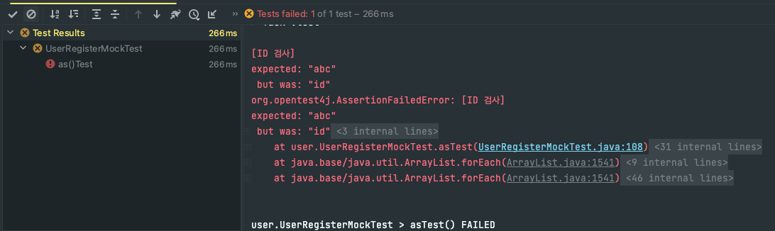 // AssertJ 사용 코드, id가 "a" 를 포함하는 지 여부를 검사한다는 것을 직관적으로 확인할 수 있음