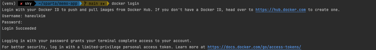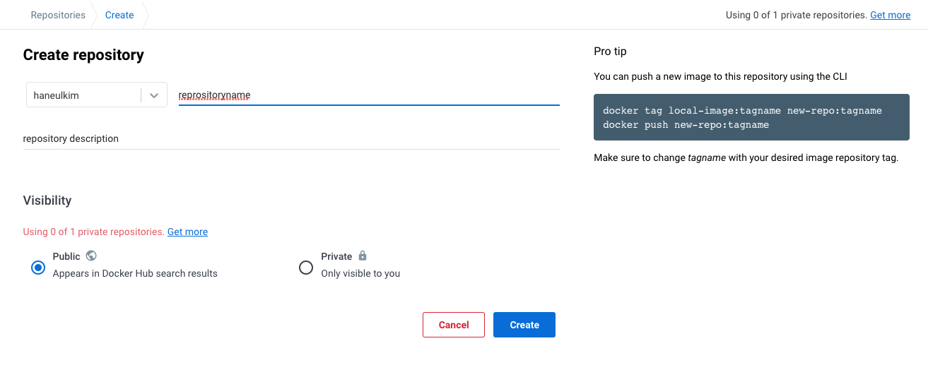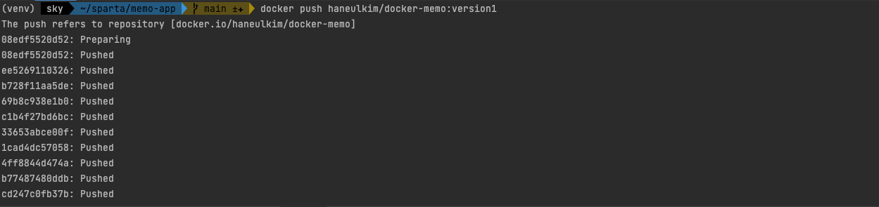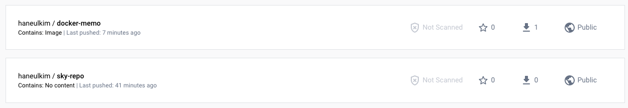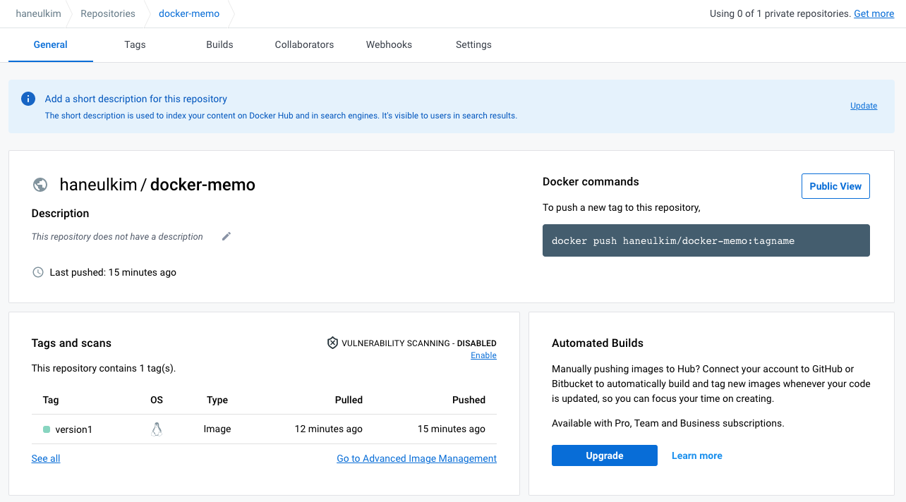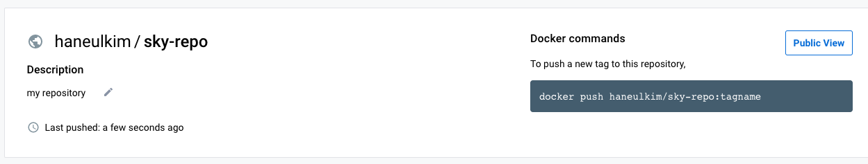 👏🏻 위에서 리포지토리명을 빼먹었는데 어떻게 push가 되는거지??? 했는데 Docker Hub 확인 했더니 리포지토리가 생성됨(리포지토리를 Docker Hub 들어가서 직접 만들지 않아도 되는거군)