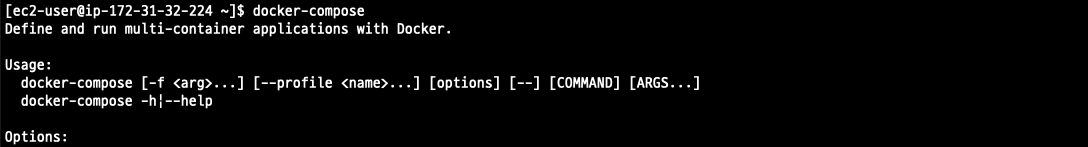 docker-compose라고 입력하면 사용방법과 옵션을 알려줌, 이렇게 나오면 설치 완료!