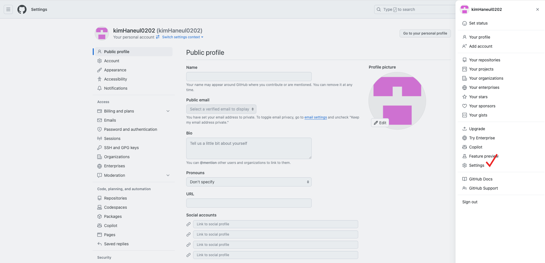 1) 깃허브 오른쪽 내 프로필 클릭 -> Settings