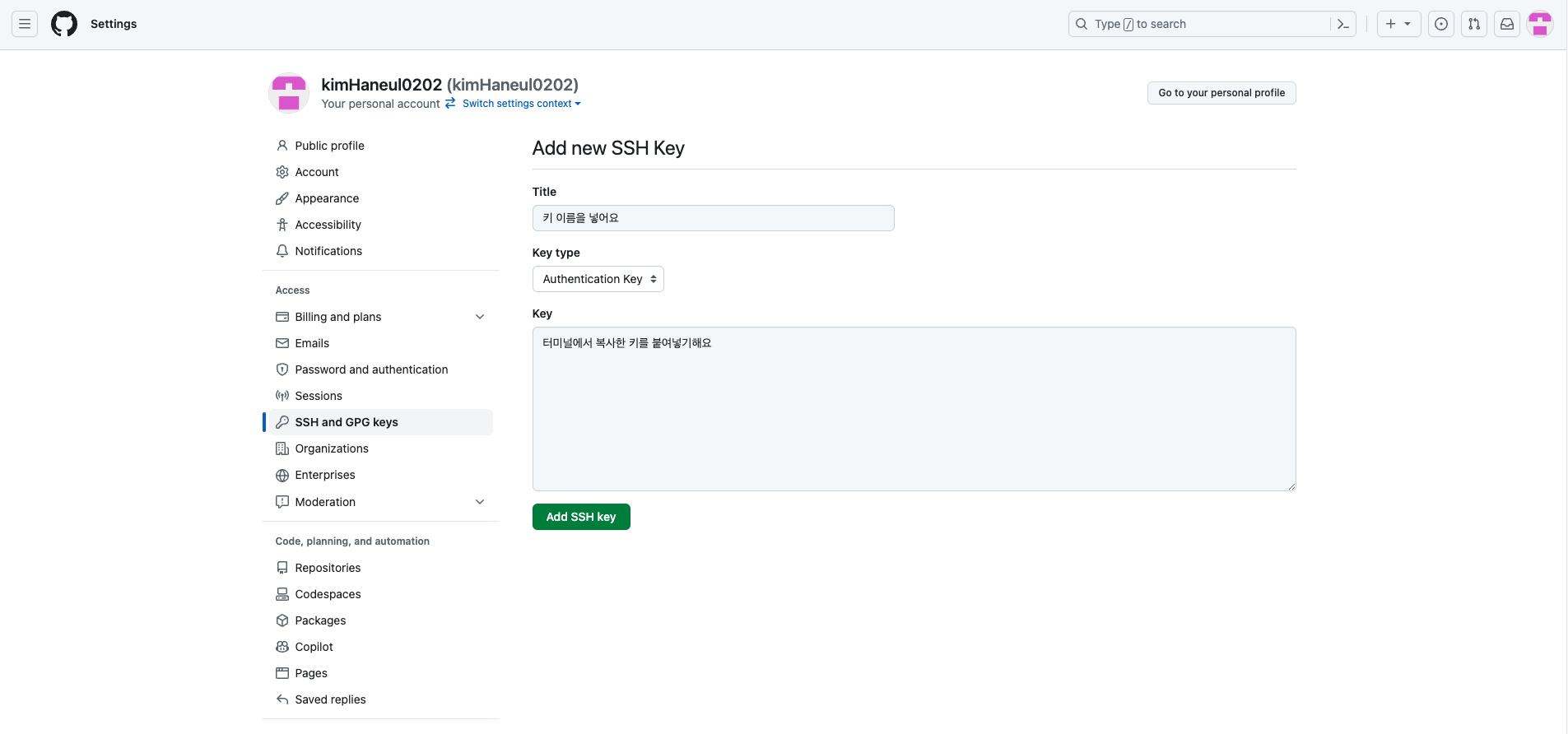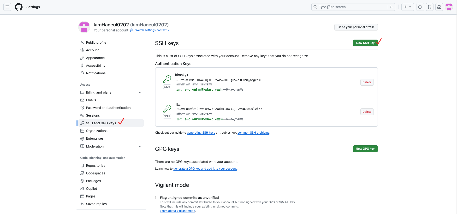 2) 왼쪽 메뉴 중 SSH and GPG Keys 클릭 - New SSH key 클릭