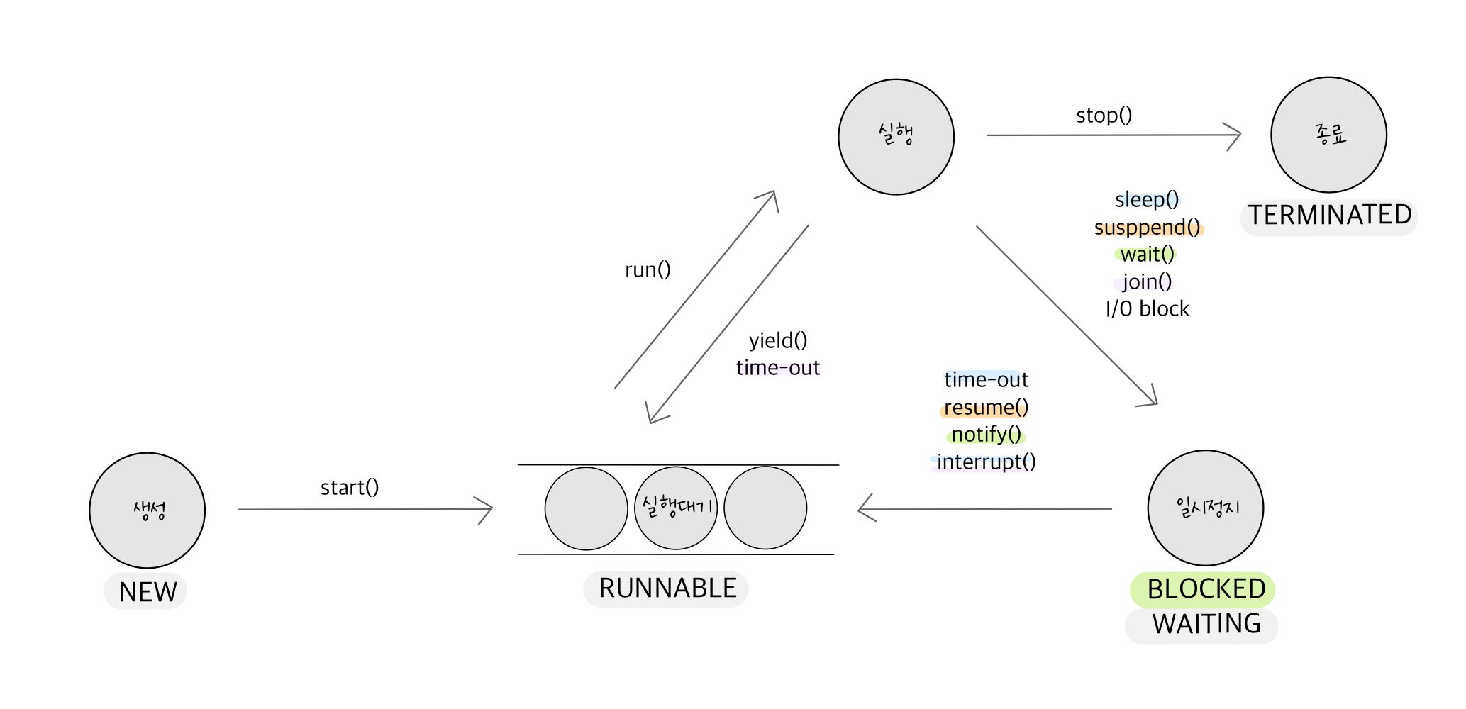 - BLOCKED: 동기화 블럭에 의해서 일시정지된 상태(LOCK이 풀릴 때 까지 기다리는 상태)