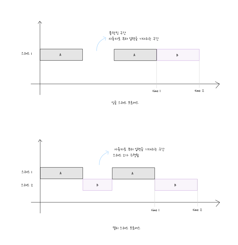 - 멀티 스레드로 처리 하면 입출력 처리를 위해 기다리는 시간 동안 다른 스레드가 작업을 처리할 수 있기 때문에 효율적