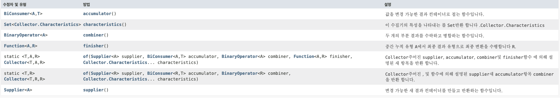 - collector()가 스트림의 요소를 수집하기 위한 방법(메서드)을 정의해 놓은 인터페이스