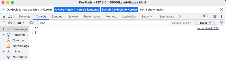▲ let 변수는 {} 중괄호 내에서 만들면 중괄호 내에서만 사용 가능(중괄호 밖에서 호출 시 정의되지 않은 함수라고 에러 발생)