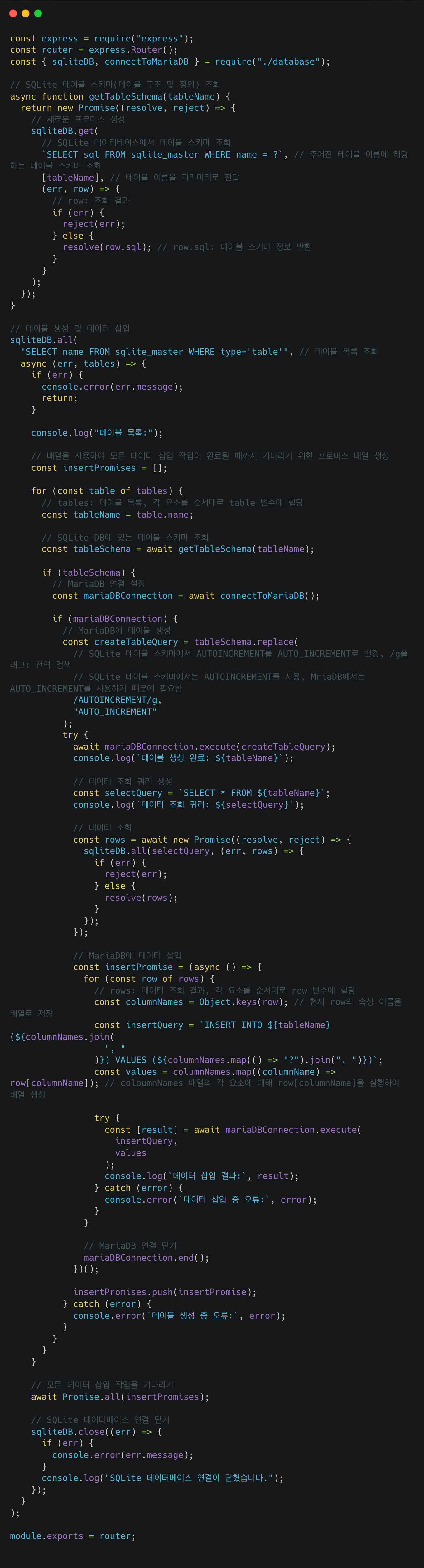 sqlite조회하고 mariadb 에 마이그레이션 (sqlite테이블 스키마 조회, mariadb 테이블생성, sqlite 데이터 조회, mariadb 데이터 삽입 모듈로 분리 예정)