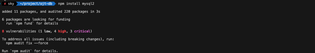 조회한 데이터를 마리아디비로 마이그레이션하기 위해 mysql2 모듈 설치