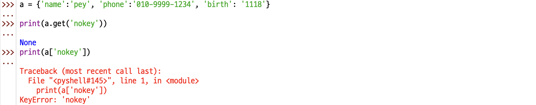 딕셔너리 안에 찾으려는 Key가 없을 경우, 미리 정해 둔 디폴트 값을 대신 가져오게 하고 싶을 때는 get(x, '디폴트 값')을 사용하면 편리