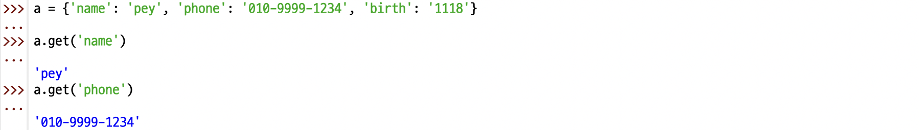 dic = {'name': 'pey', 'phone': '010-9999-1234', 'birth': '1118'}