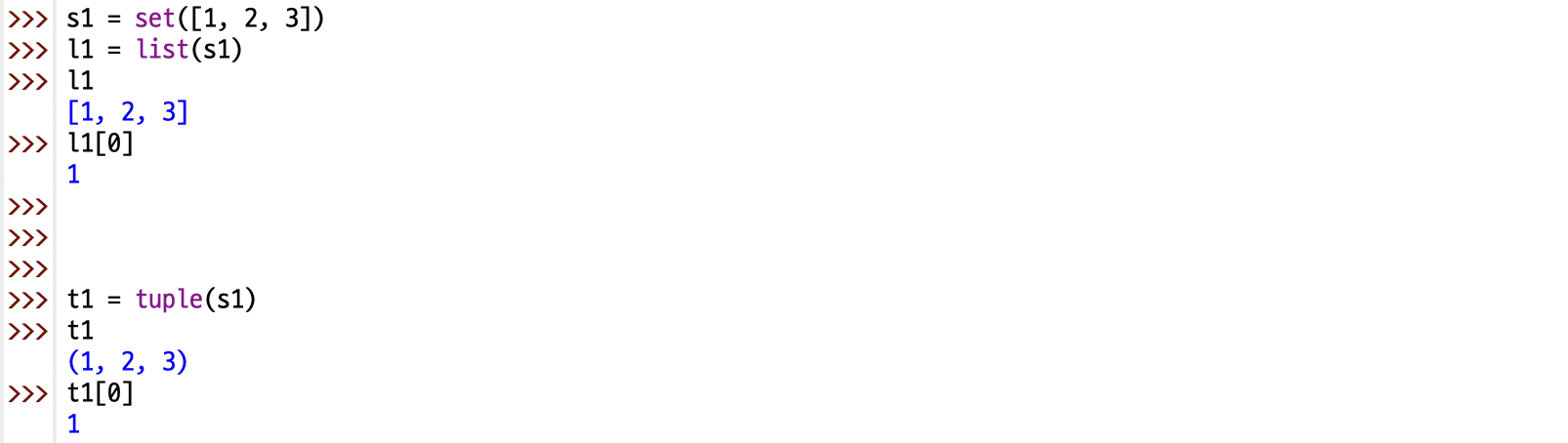 set자료형에 저장된 값을 인덱싱으로 접근하려면 아래와 같이 리스트나 튜플로 변환한 후 사용해야함