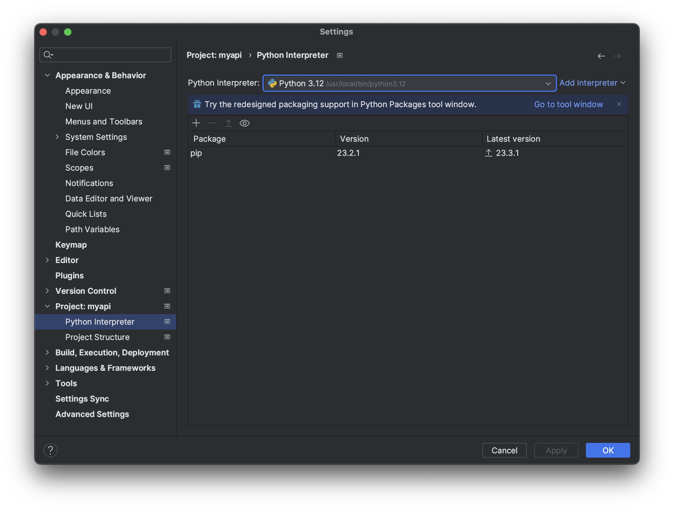 파이썬을 설치한 디렉토리로 인터프리터 위치가 잡혀있는 것을 확인할 수 있음