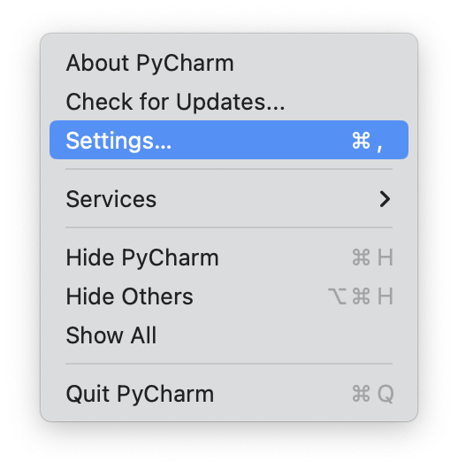 cmd + , 키를 누르거나 pycham -> settings를 클릭