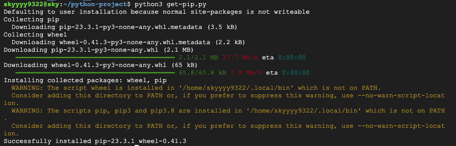 경고 내용은 로컬 디렉토리 (/home/skyyyy9322/.local/bin)에 위치하고 있어서 시스템 PATH에 포함되어 있지 않다는 것