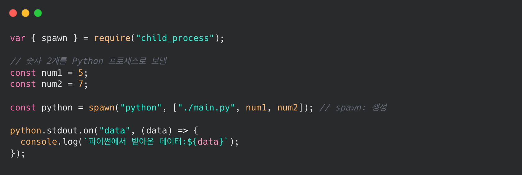 spawn 함수를 사용하면 Node.js에서 다른 프로그램을 실행하고 그 결과를 처리할 수 있음