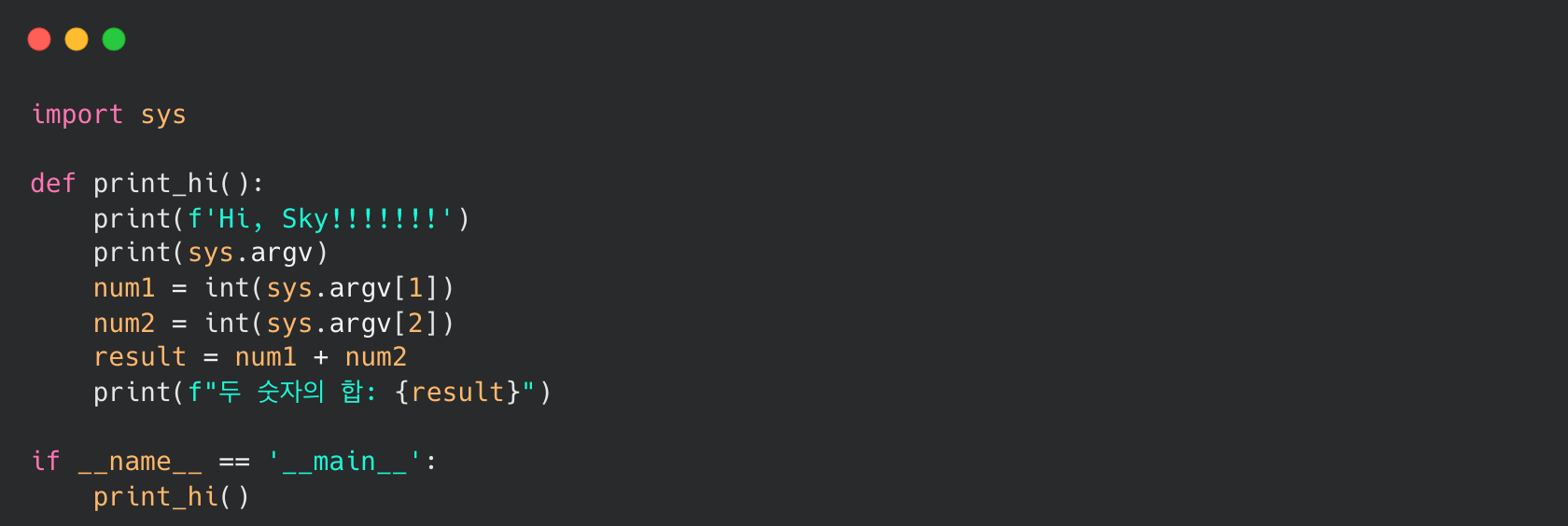 sys.argv: 이 변수는 명령줄에서 전달된 인자(커맨드 라인 인자)를 포함한 문자열 리스트로 파이썬 스크립트를 실행할 때 커맨드 라인에서 전달하는 인자들을 접근하려면 주로 이 변수를 사용함 첫번째 요소인 sys.argv[0]은 스크립트의 이름이며, 그 뒤로 전달된 인자들이 순서대로 나열됨. 이를 통해 외부 스크립트로 데이터를 전달할 수 있음