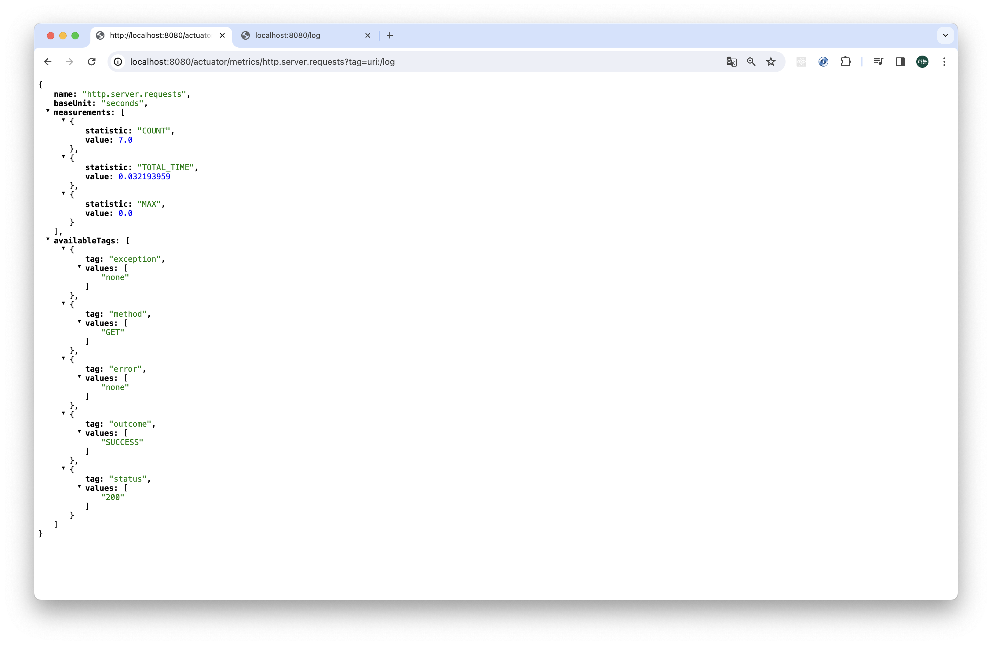 http://localhost:8080/actuator/metrics/http.server.requests?tag=uri:/log&tag=status:200