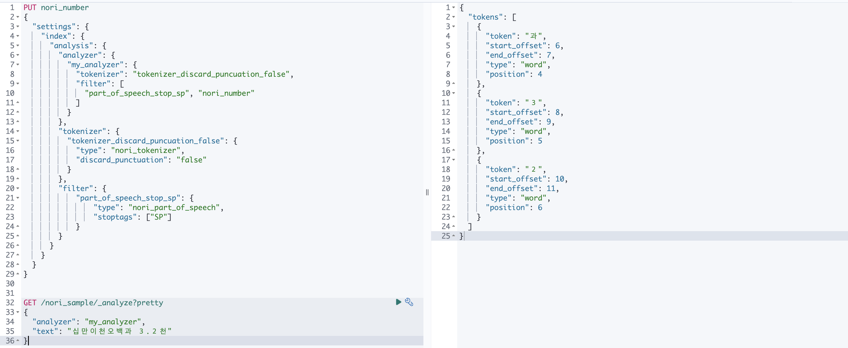 표준화된 숫자의 일부가 아닌 구두점 문자를 인덱스에서 제거하기 위해서는 nori_number뒤에 제거하려는 구두점이 포함된 중지 토큰 필터를 추가