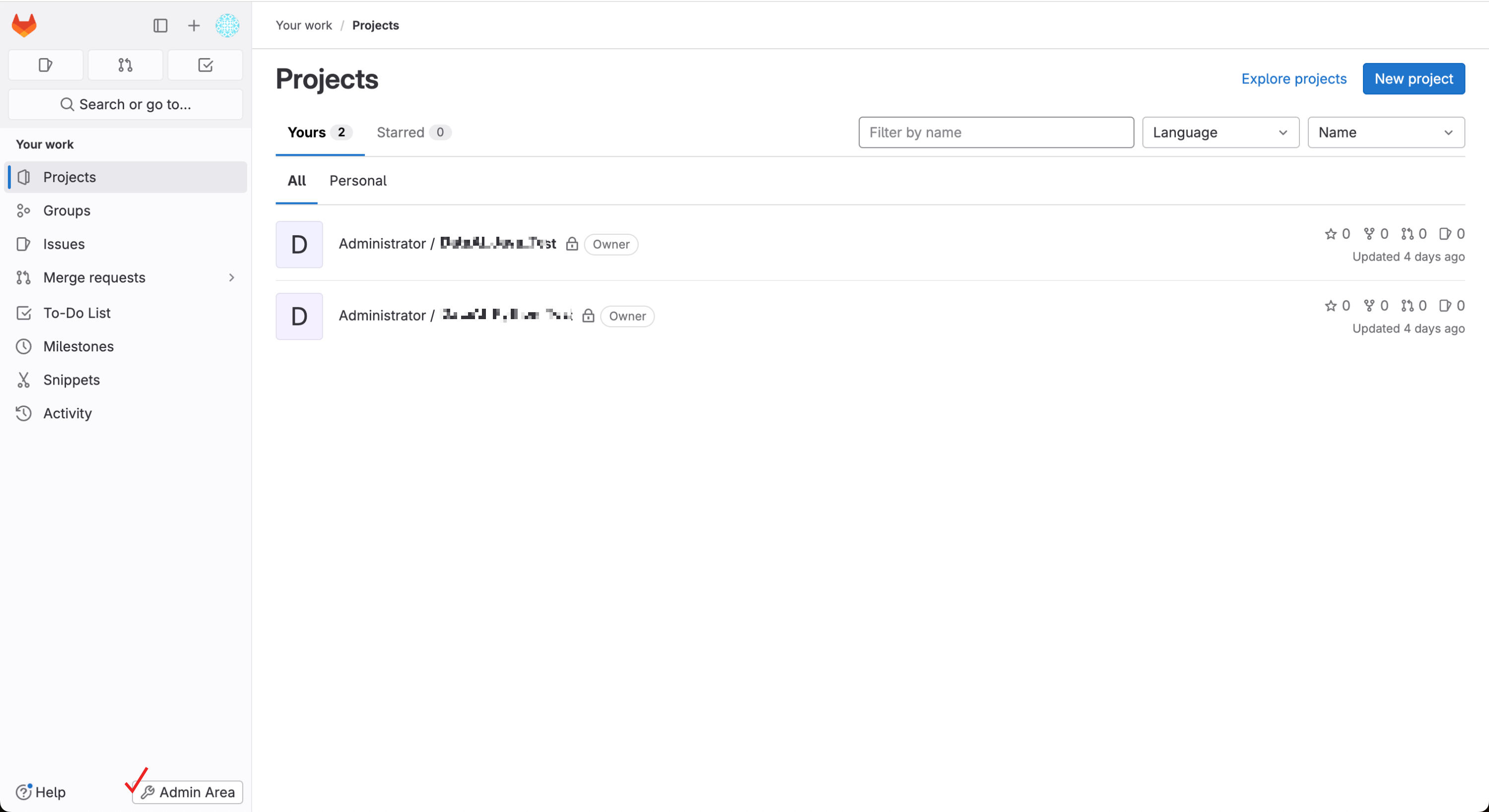 왼쪽 메뉴 하단에 Admin Area 클릭