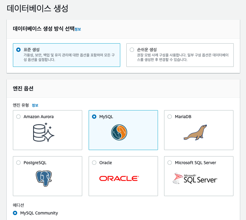 2. 데이터베이스 생성 방식: 표준 생성, 엔진옵션-MySQL