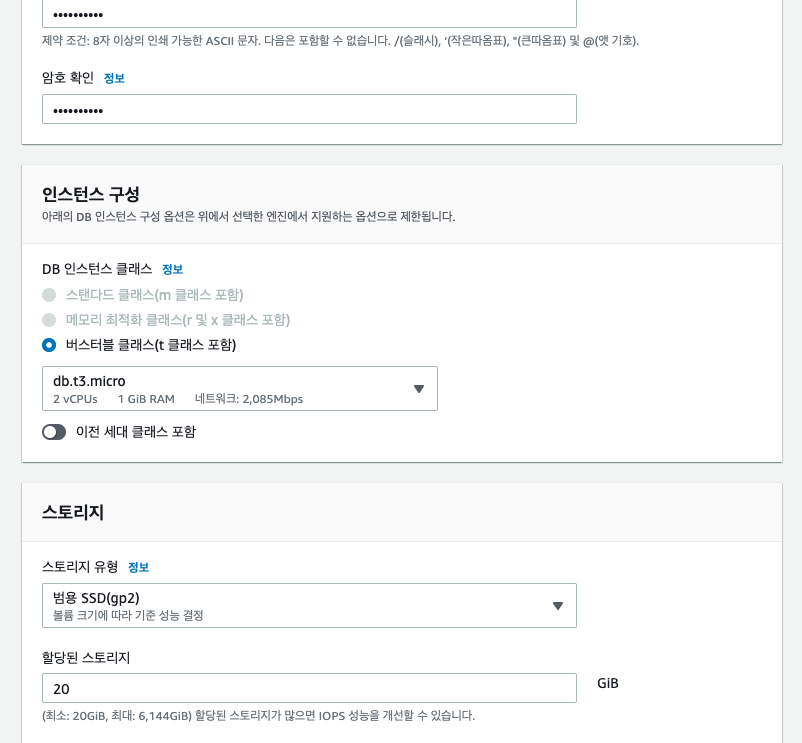 3. 버전: 최신버전 / 템플릿: 프리티어 / 설정: DB인스턴스 식별자 이름 정하기, 자격 증명 설정: 이름, 암호 정하기(잊으면안됨)