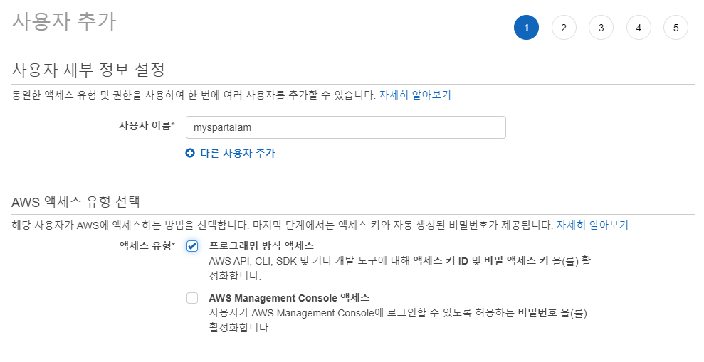 용자 이름, 엑세스 유형 중 프로그래밍 방식 엑세스를 체크하고 다음 단계로 넘어갑니다. 프로그래밍 방식 엑세스는 개발 언어와 연계해서 사용하는 방식이고, AWS Management Console 엑세스는 해당계정을 AWS 콘솔에서 로그인해서 사용하게 하는 방식입니다.