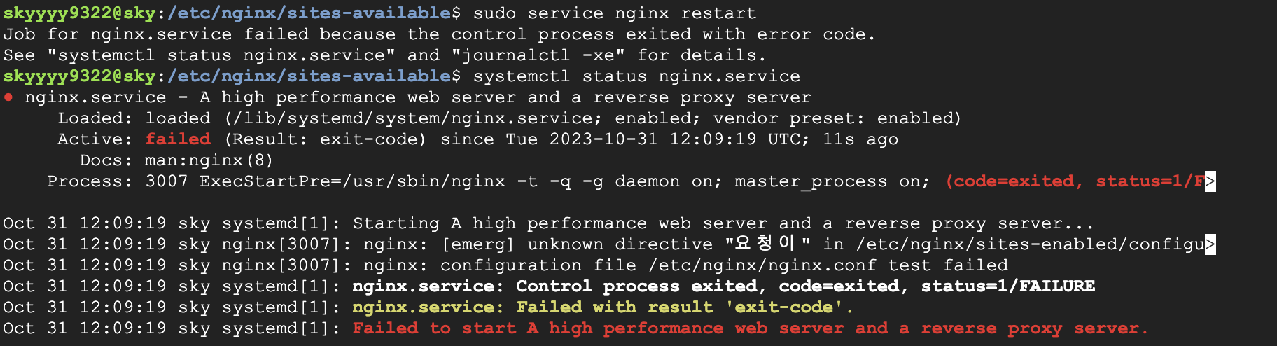 nginx: [emerg] unknown directive "요청이" in /etc/nginx/sites-enabled/configuration:6