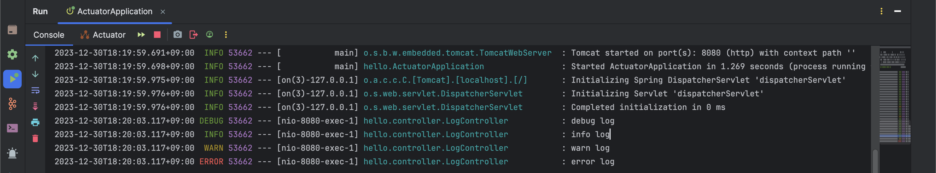 실행해보면 아래와 같이 debug 레벨 이상 로그 모두 확인할 수 있음