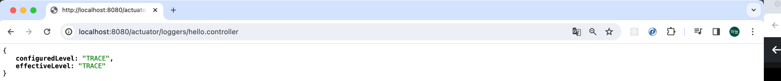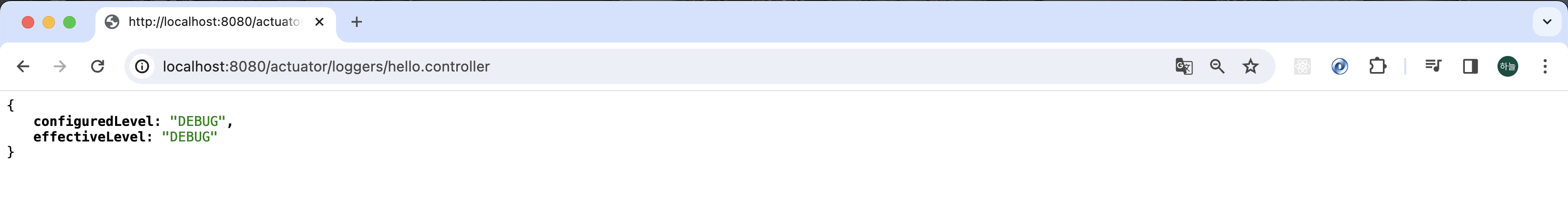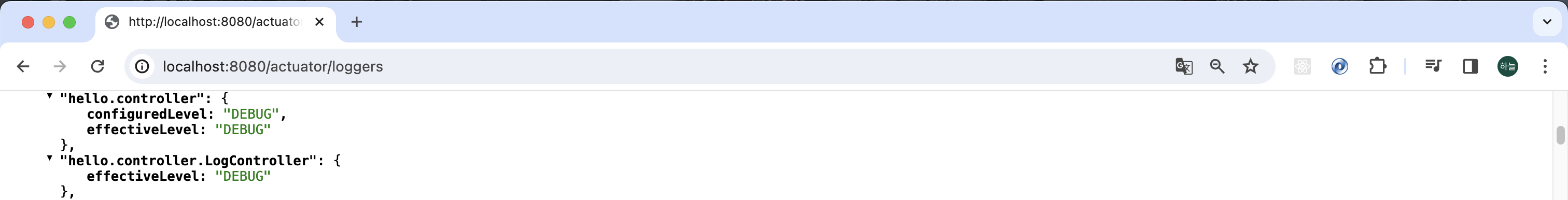 actuator/loggers를 확인해보면 위에서 설정한 hello.controller를 debug 레벨로 설정한 것을 확인할 수 있음