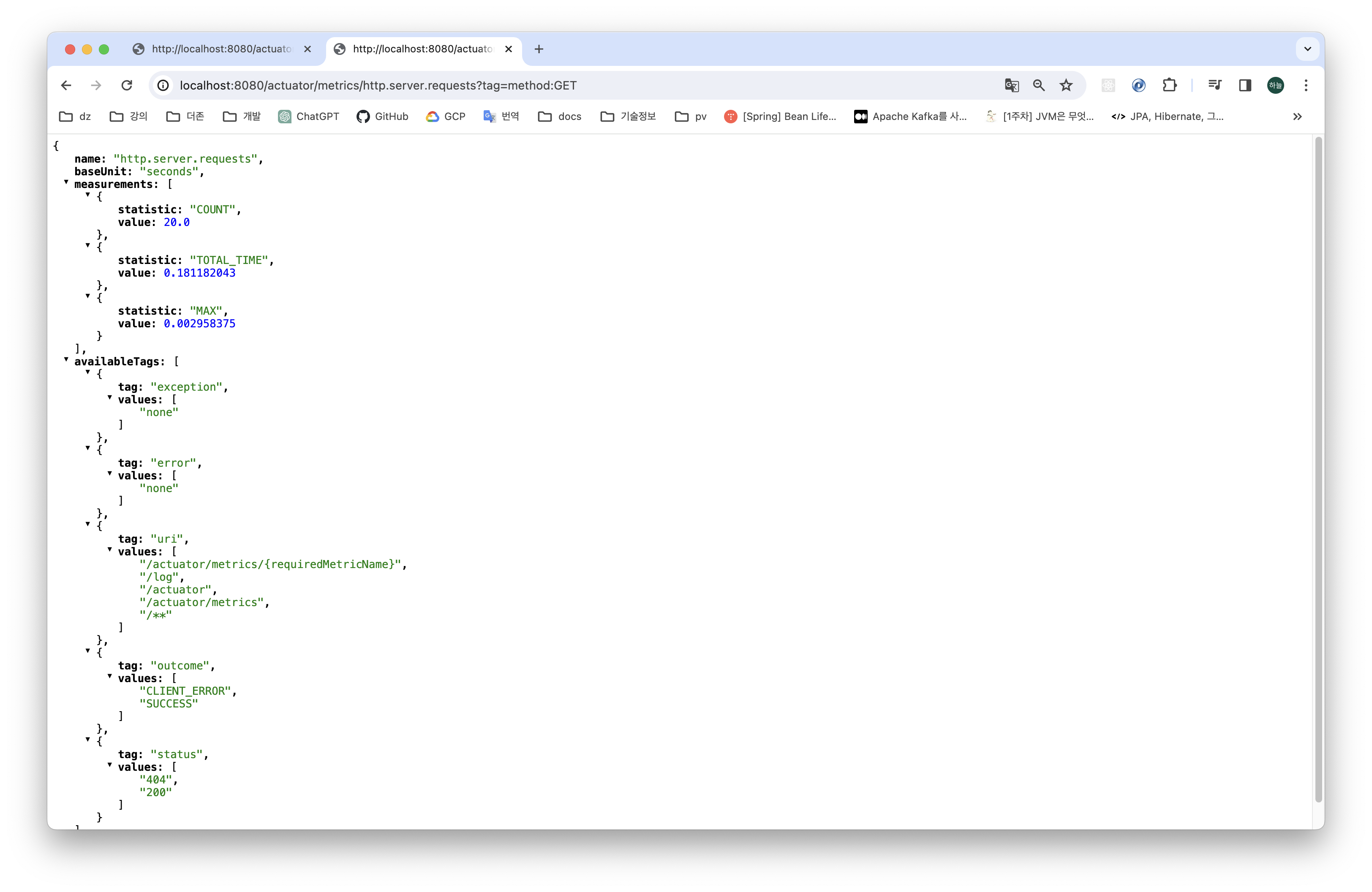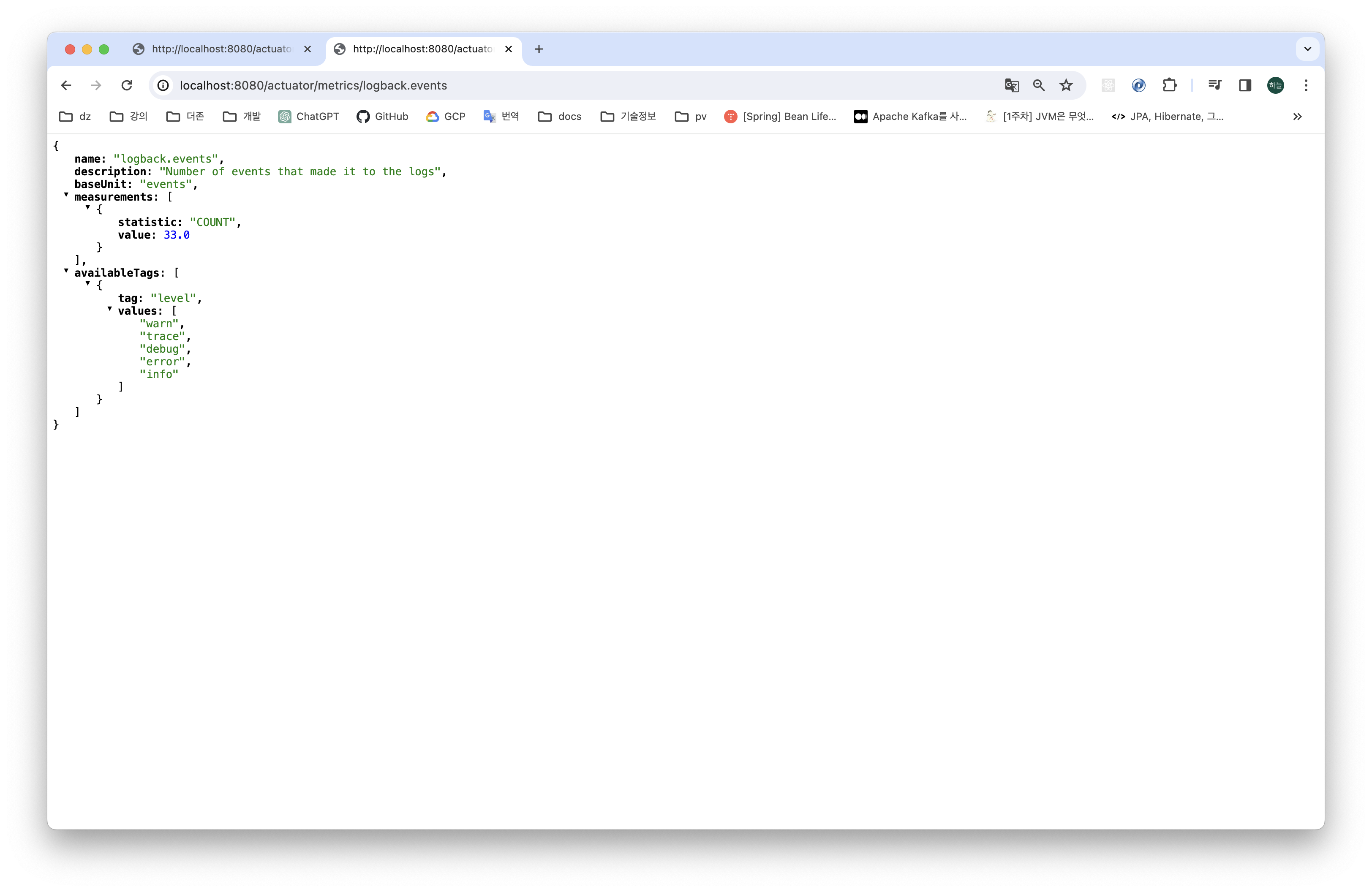 - logback.events: logback 로그에 대한 메트릭을 확인할 수 있음